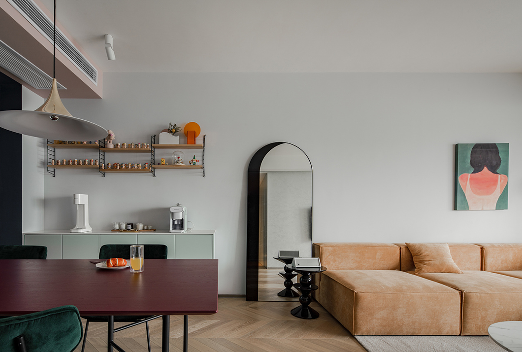混搭技巧,如利用造型不同、顏色相同的餐椅組合,餐區的餐椅造型多變且風格迥異,但因為它們都是黑色,在視覺上形成了統一感,所以并不會產生違和感