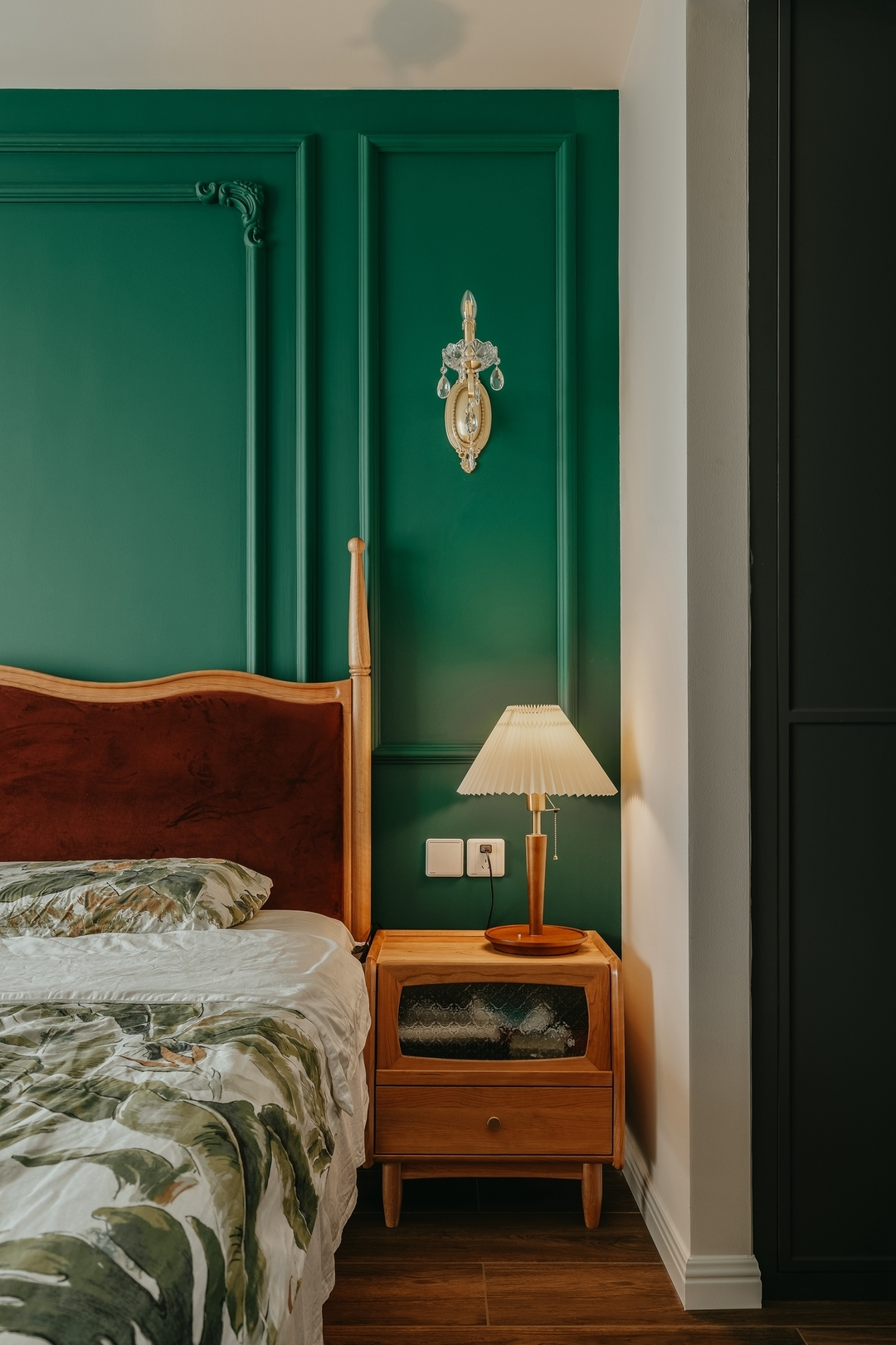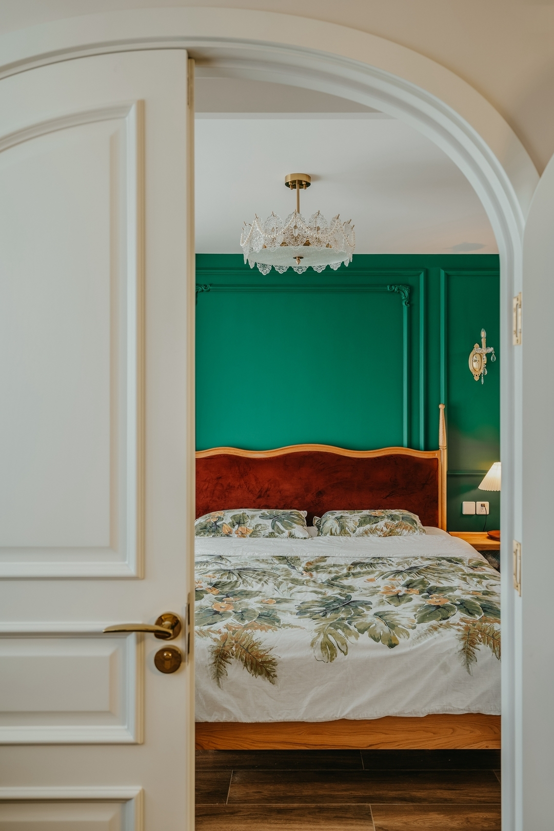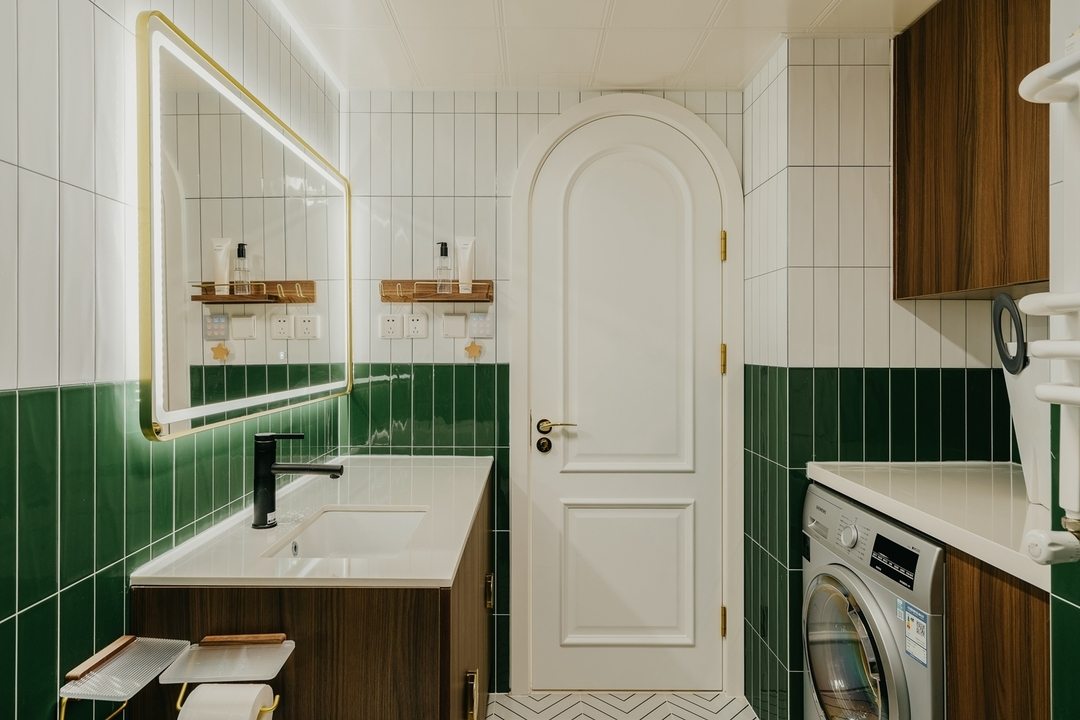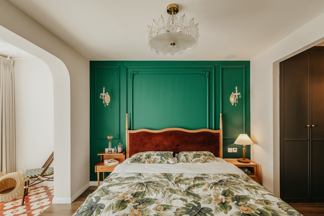設(shè)計(jì)策略: 1. 原有衣帽間封閉無采光,打通臥室與衣帽間,更顯空間通透 2. 擴(kuò)大衛(wèi)生間面積,做干濕分離設(shè)計(jì) 3. 改變?cè)斜容^方正的格局,加入弧形元素 4. 在色彩上使用濃郁的復(fù)古綠為主色調(diào),為空間注入靈魂