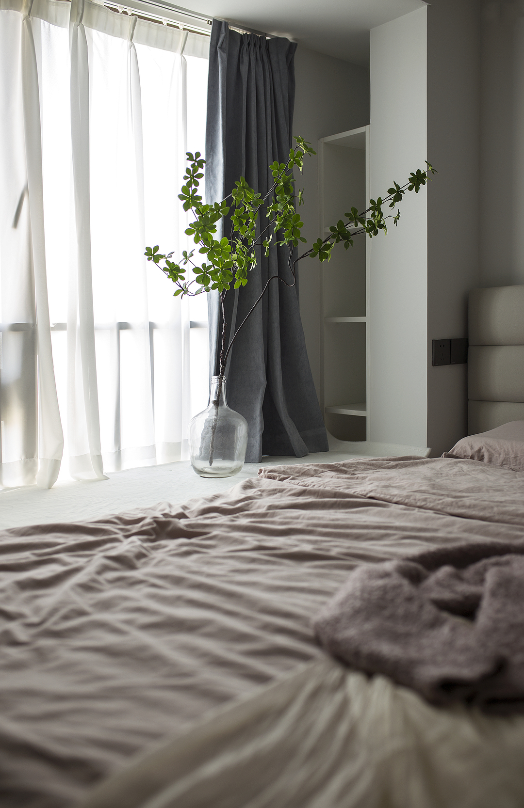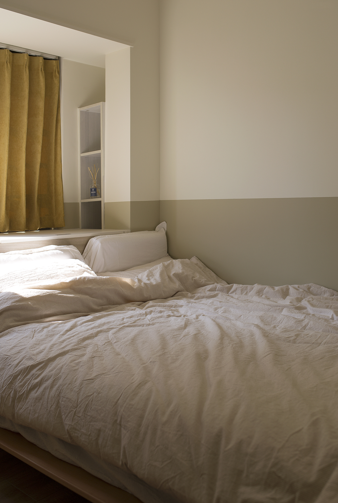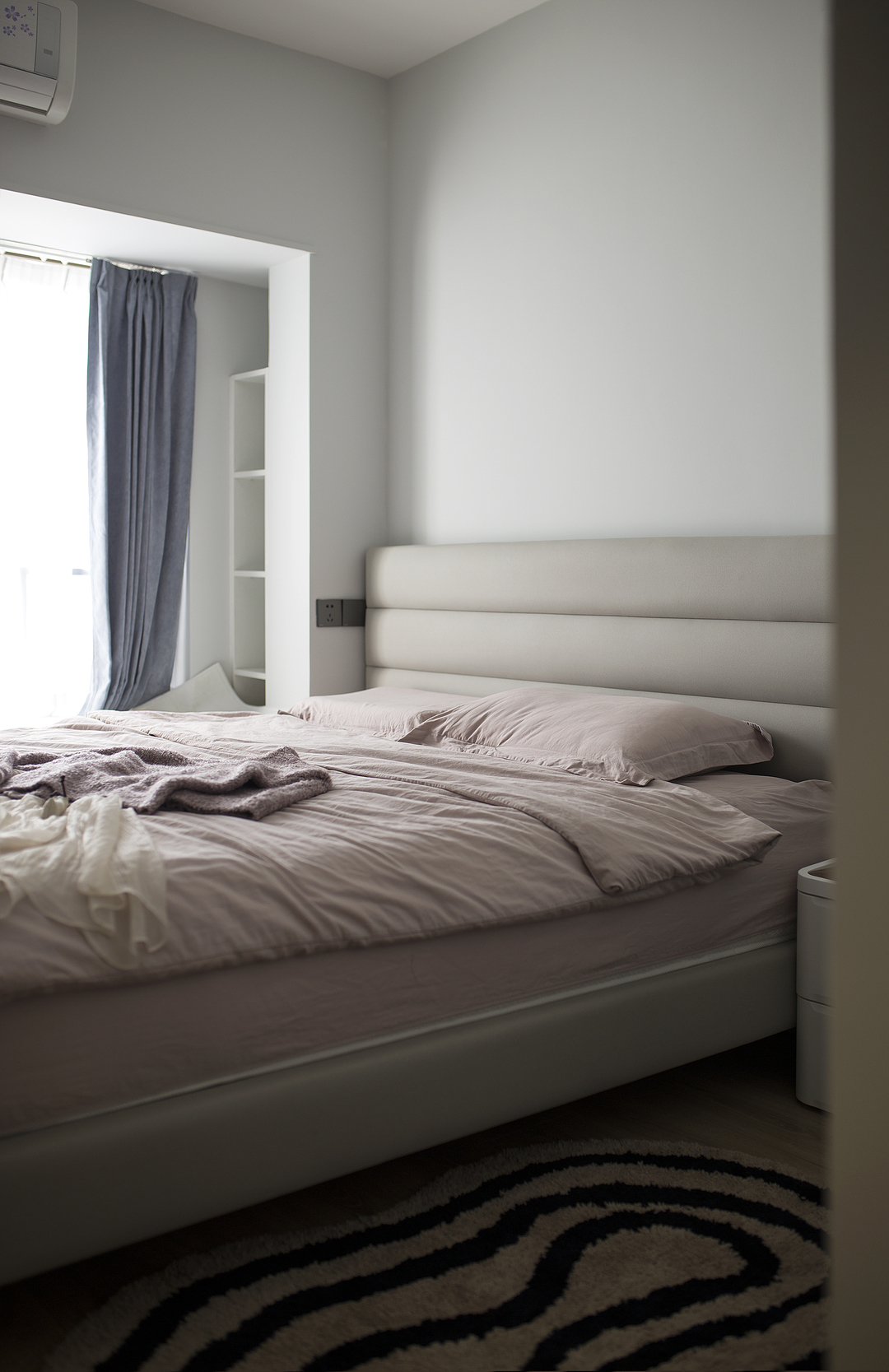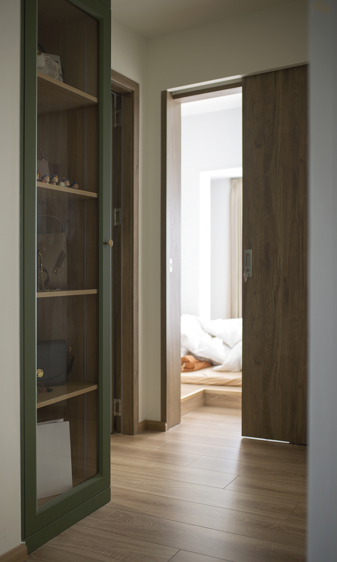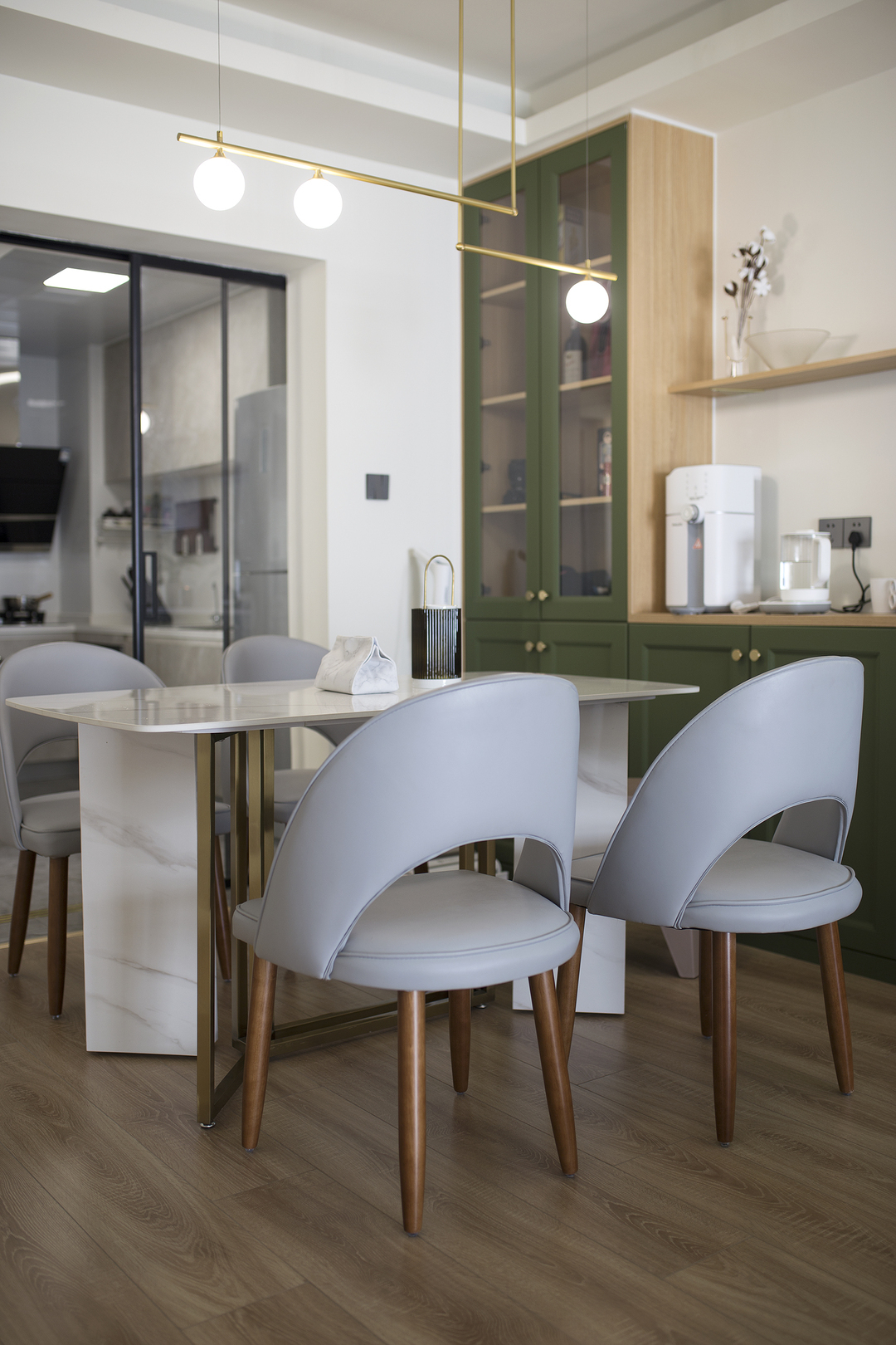 ①廚房間隔墻體拆除后,占用一部分原有過道的位置,廚房的櫥柜做L形,讓廚房的操作臺和空間收納提升。同時用L形的玻璃推拉門隔斷廚房,一側的推拉門可完全推入墻內,廚房可開放也可以封閉。②將兩個次臥以及間隔衛生間的墻體拆除,重新分割了空間。增加了衛生間的空間,將衛生間一分為二,獨立分割出一個帶蹲便器和小洗手臺的空間。③陽臺封窗和客廳連通,增大客廳視野。