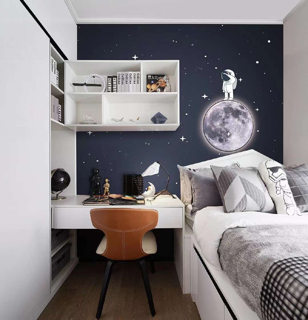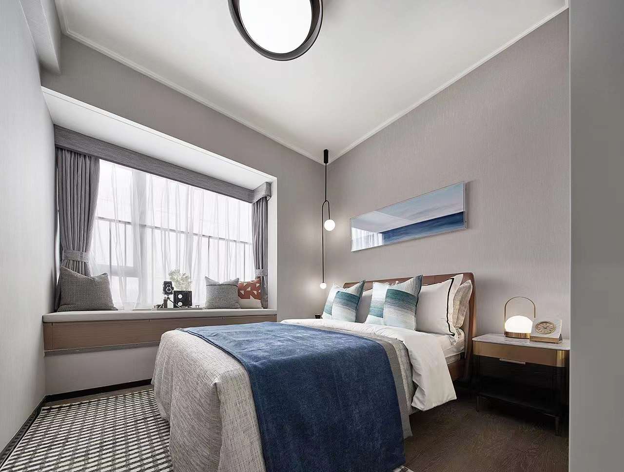 客廳空間褪去浮華的裝飾,以素白與雅灰為主,小面積的咖色與藍(lán)色帶起節(jié)奏感。從陶藝文化中萃取而來的元素,化為各種性格鮮明的線條、形狀和肌理,充斥在空間的細(xì)節(jié)處。藝術(shù)與生活的邊界在此彌散,營造出靜謐而有格調(diào)的閑適光景!